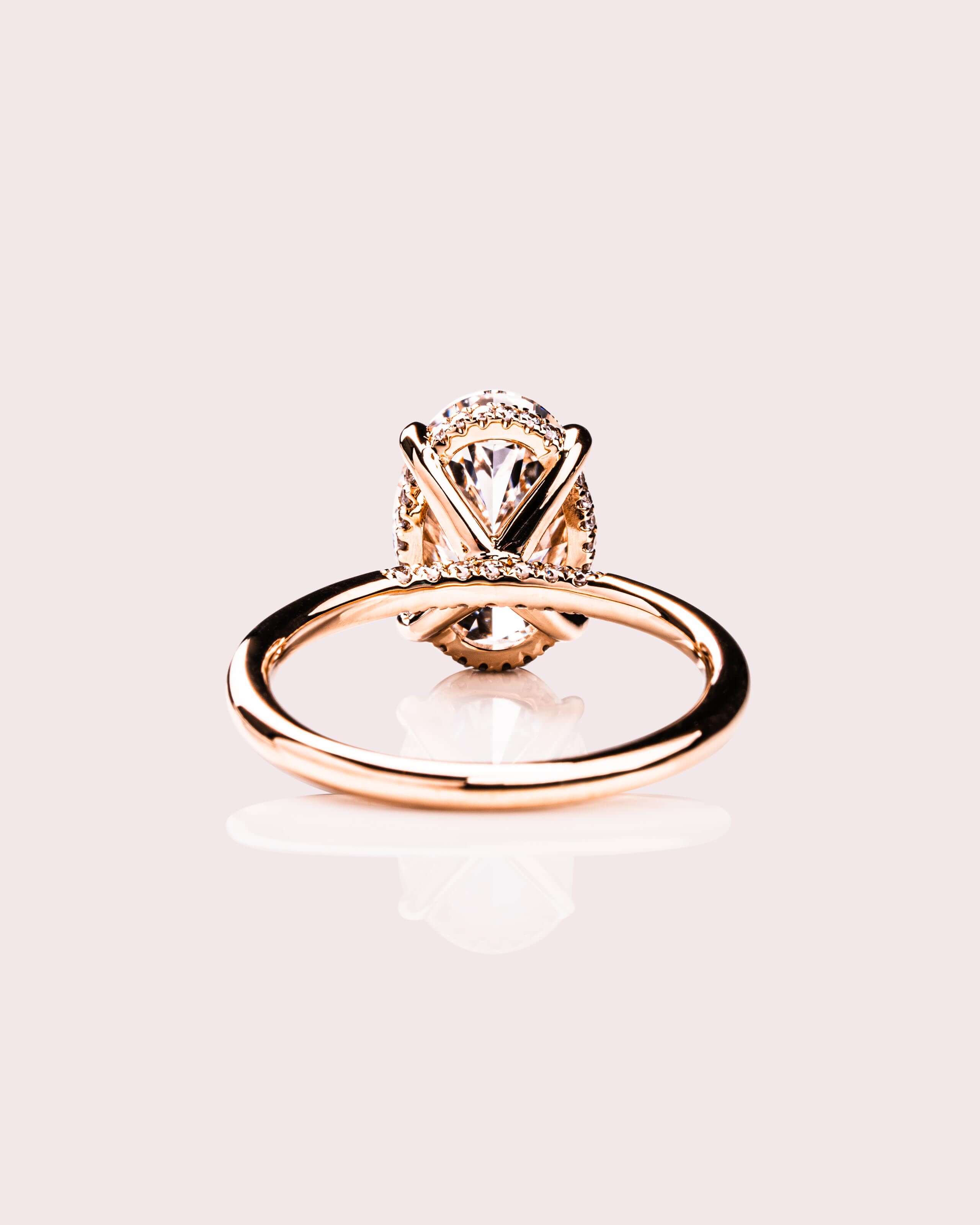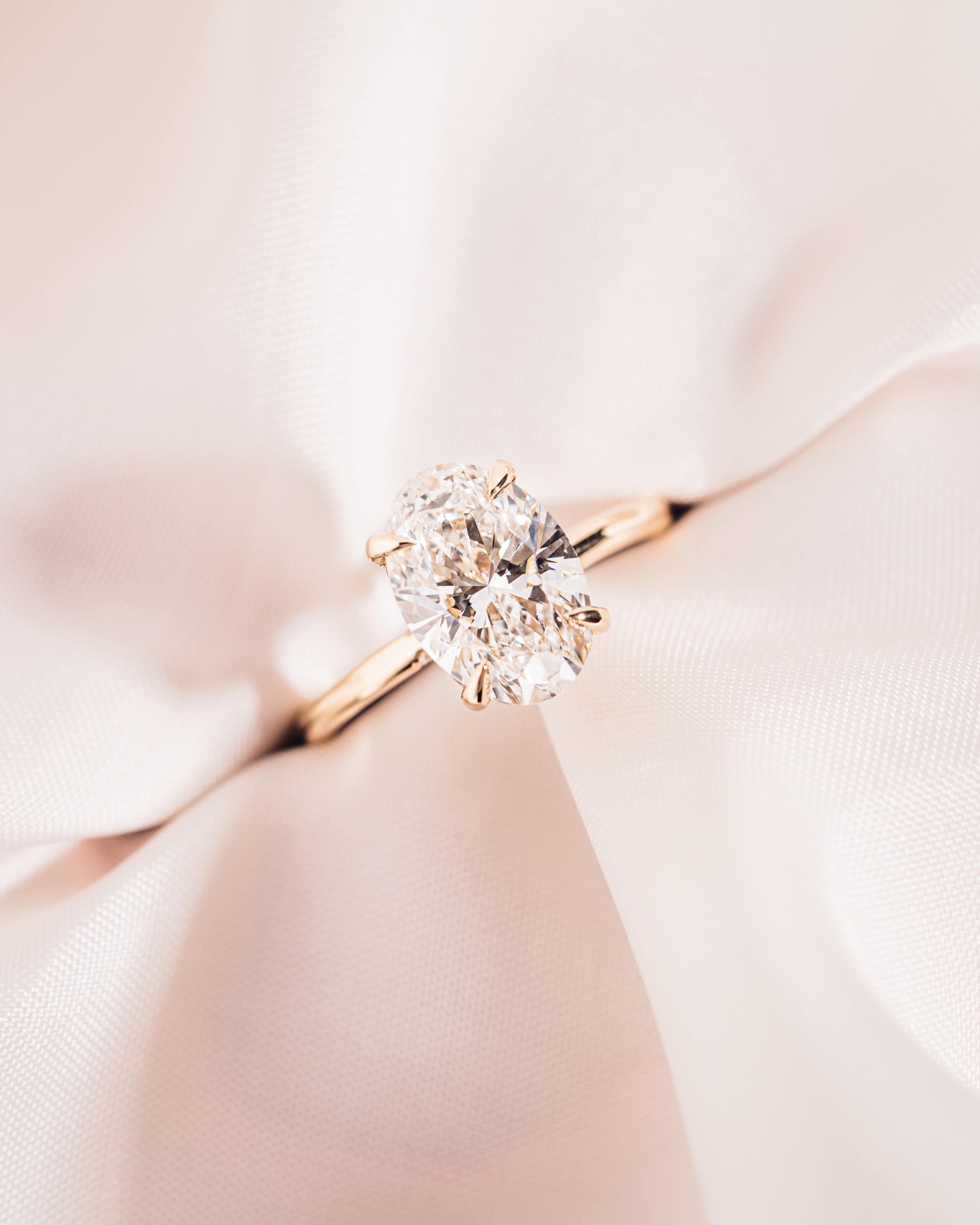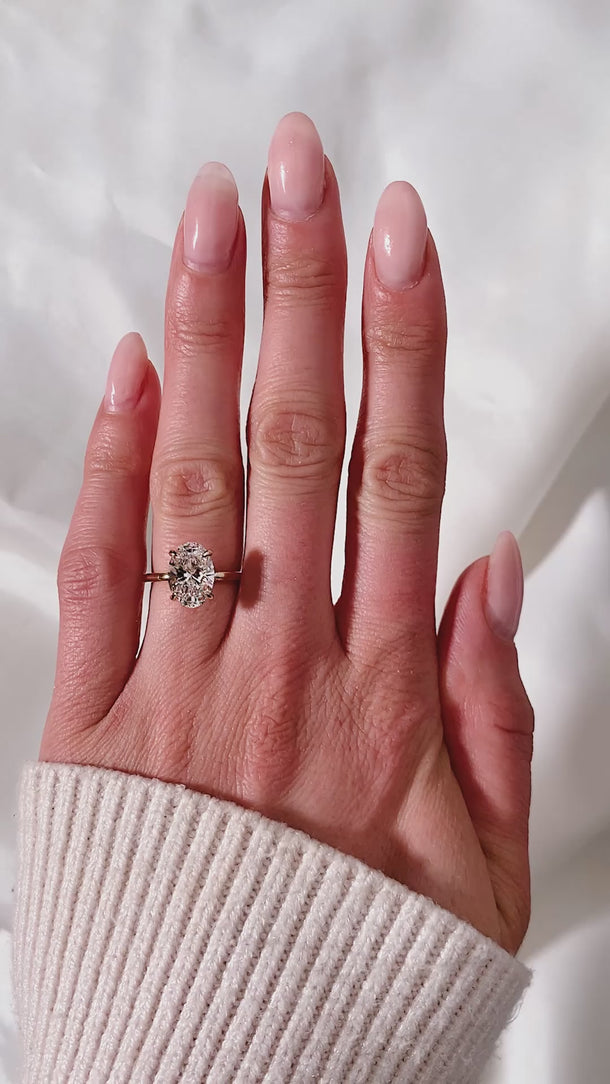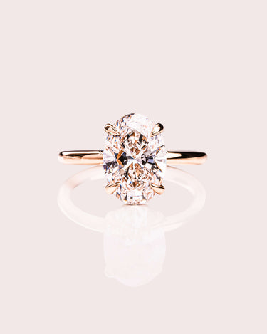The Harper Oval Lab Diamond Engagement Ring features a radiant oval lab-grown diamond set in a classic solitaire design with four elegant X claw prongs and a hidden halo for added brilliance. A pavé bridge adds extra sparkle, and the gold band completes the timeless design.