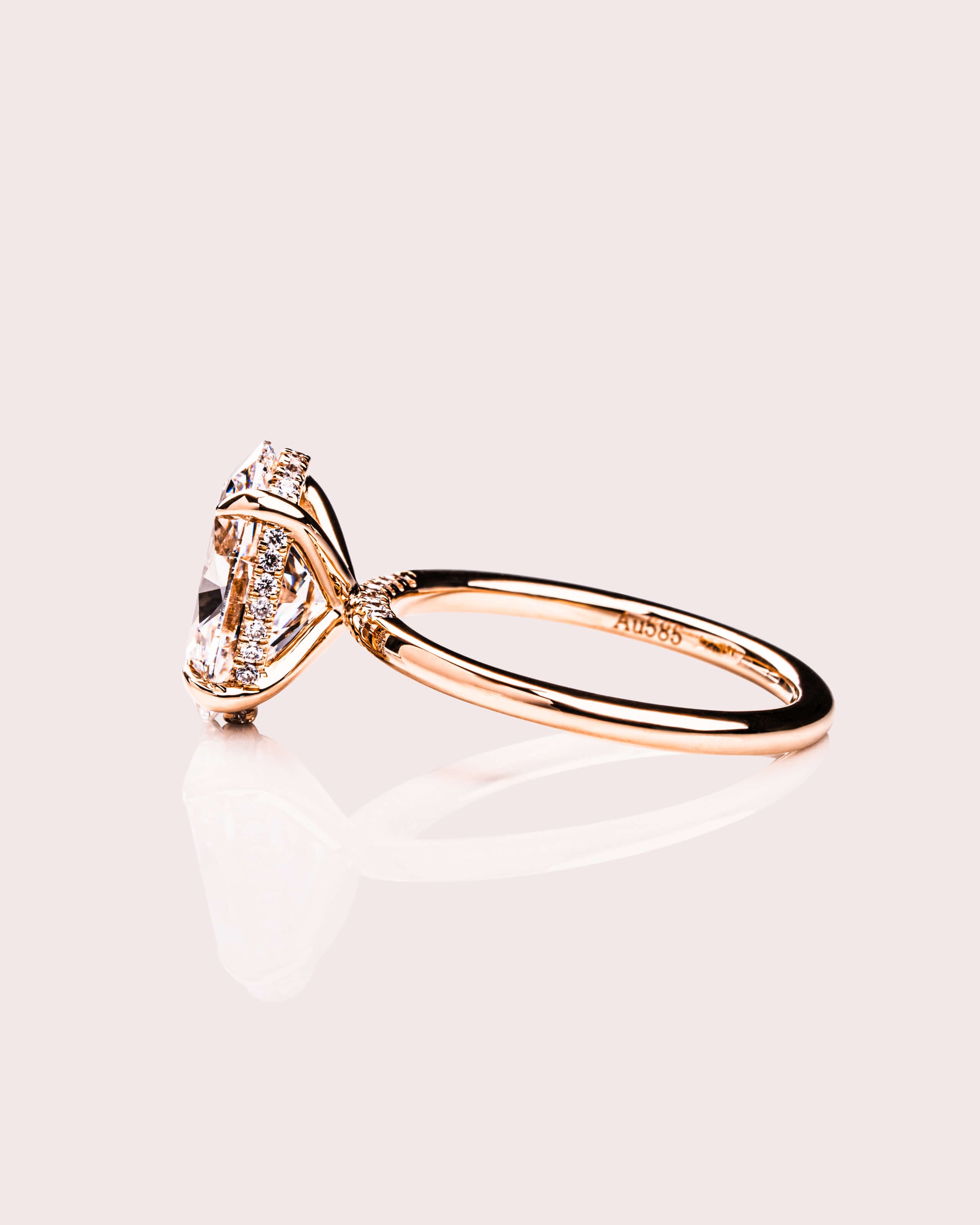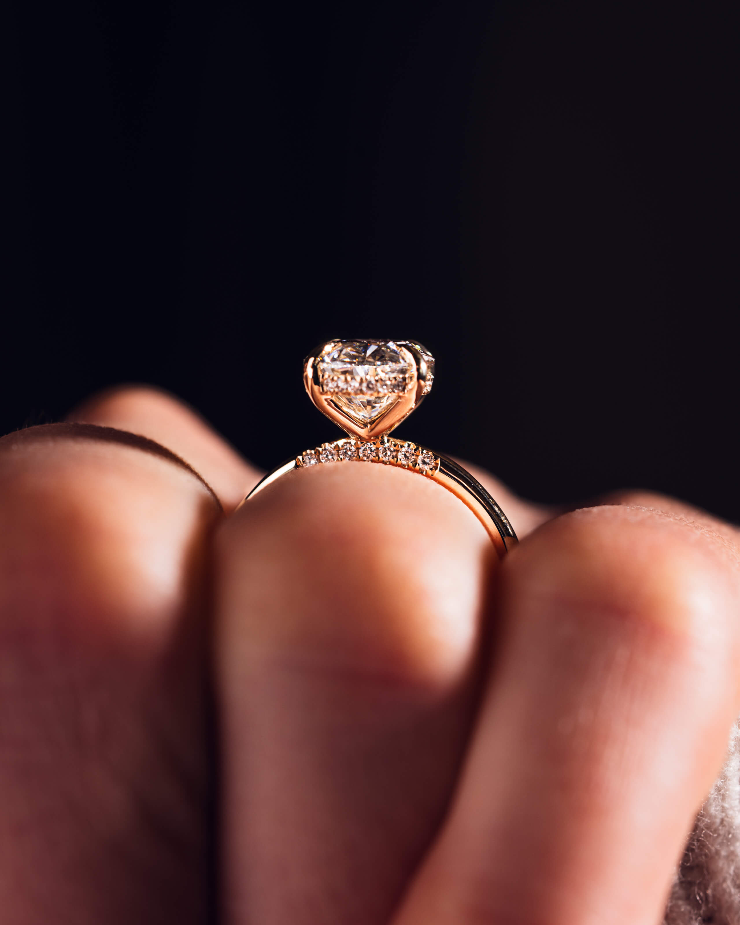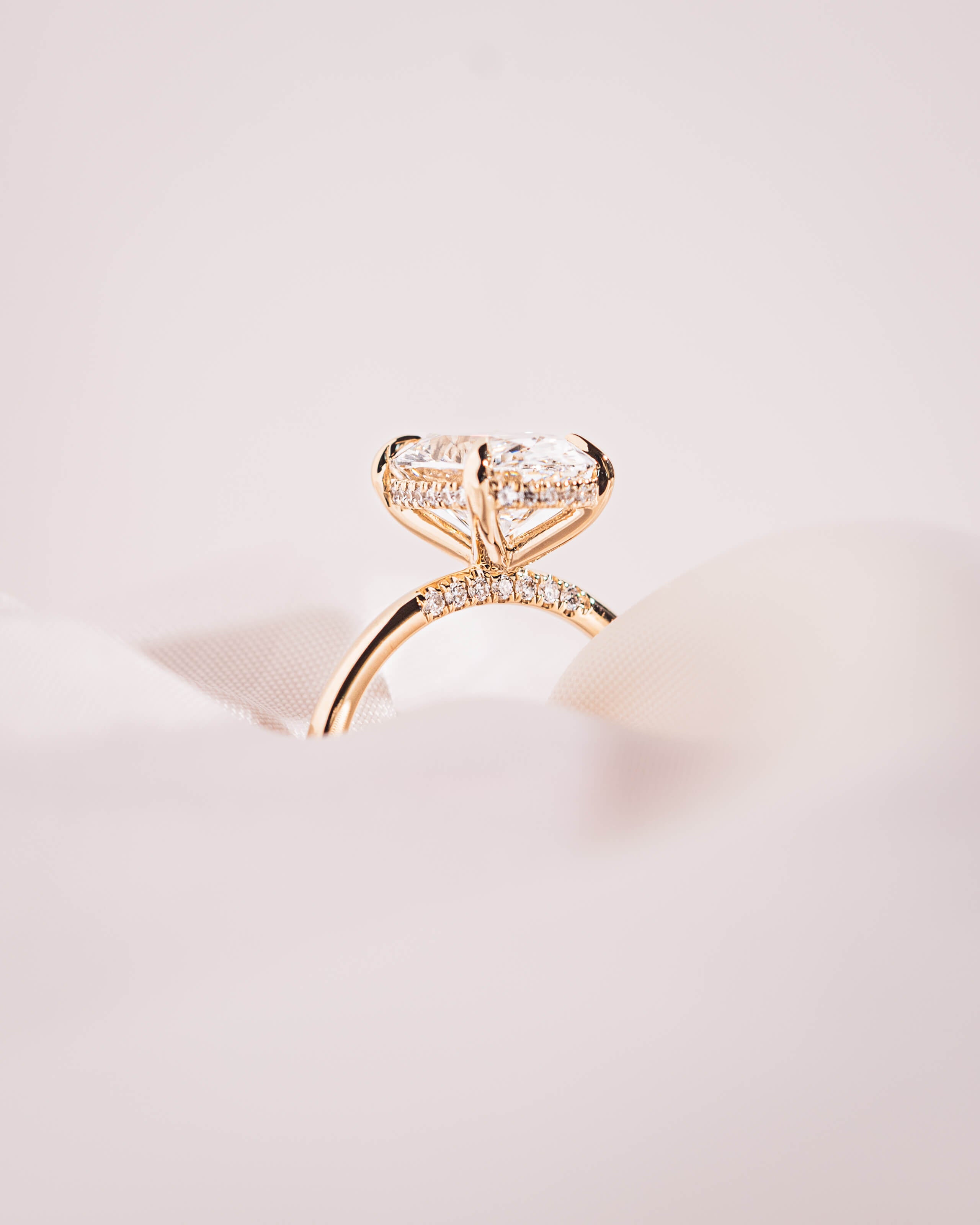 The Harper Oval Lab Diamond Engagement Ring features a radiant oval lab-grown diamond set in a classic solitaire design with four elegant X claw prongs and a hidden halo for added brilliance. A pavé bridge adds extra sparkle, and the gold band completes the timeless design.